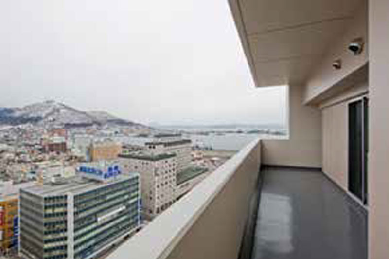 商品性については、光井純&アソシエーツ建築設計事務所様よりデザイン監修いただき、人が集い、交流し、賑わいを生み出す都市再生に貢献するデザインをコンセプトに、高層部は一邸一邸に違う顔を求め、カラーは函館の未来を語るまぶしい白を基調としています。フレームやバルコニーを活かし、東西南北の4面すべてに異なるファサードを描き出しました。さらにバルコニー内のカラーやフレームのデザインに細やかな変化をプラスし、一邸として同じものがないかのような表情を与え、集合住宅でありながら一邸一邸にアイデンティティを持たせています。