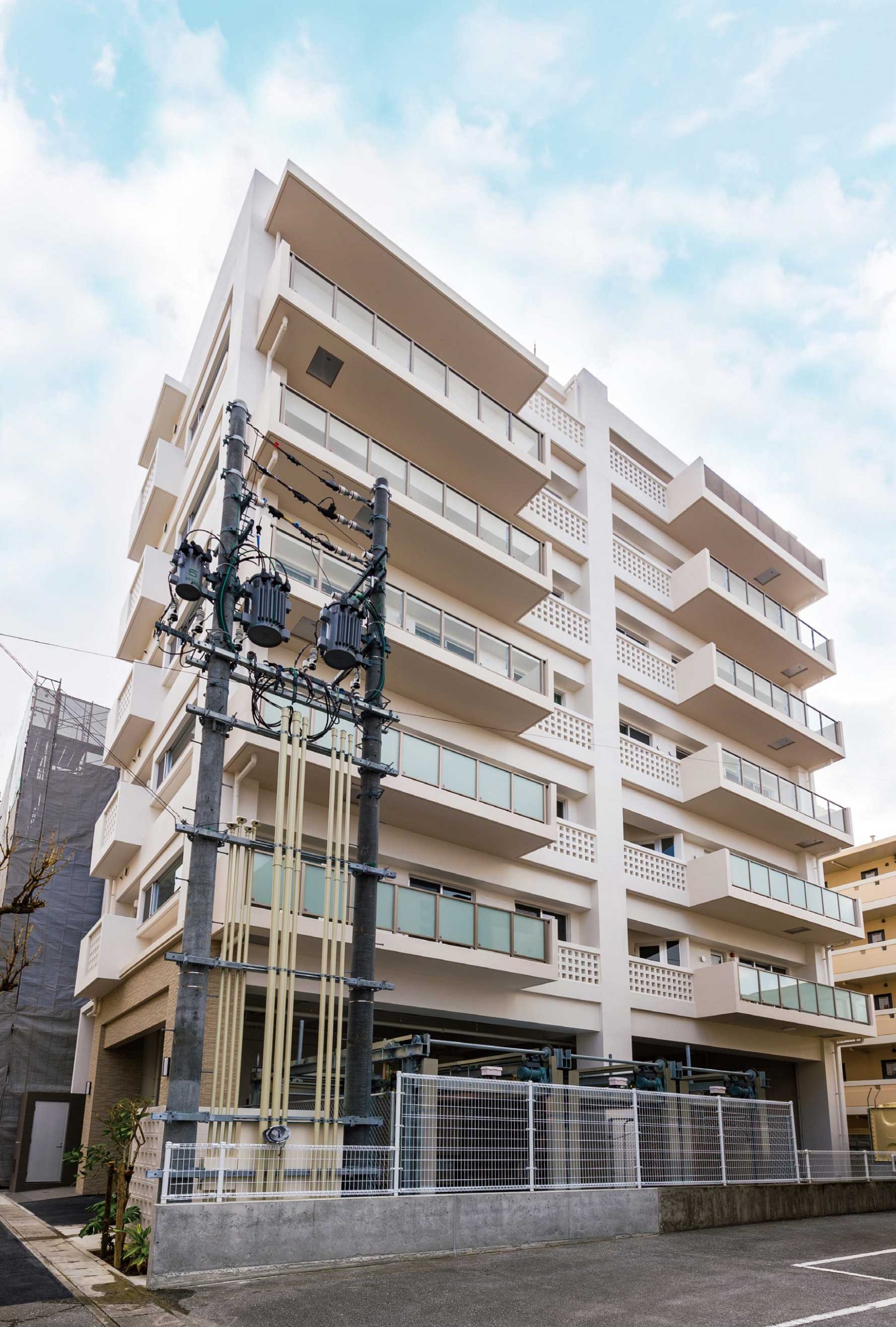 本物件は大型ショッピングセンターに隣接し生活の利便性は高い立地であるが、海への眺望は前面に3階建ての建物があり阻まれています。そのため1階の階高を4.9mとし、中間階でも眺望が確保できるように計画を行いました。沖縄県では、移動手段として車の利用が不可欠なため100坪の敷地に11邸分の駐車スペースを設ける計画としました。(駐車場率100%)