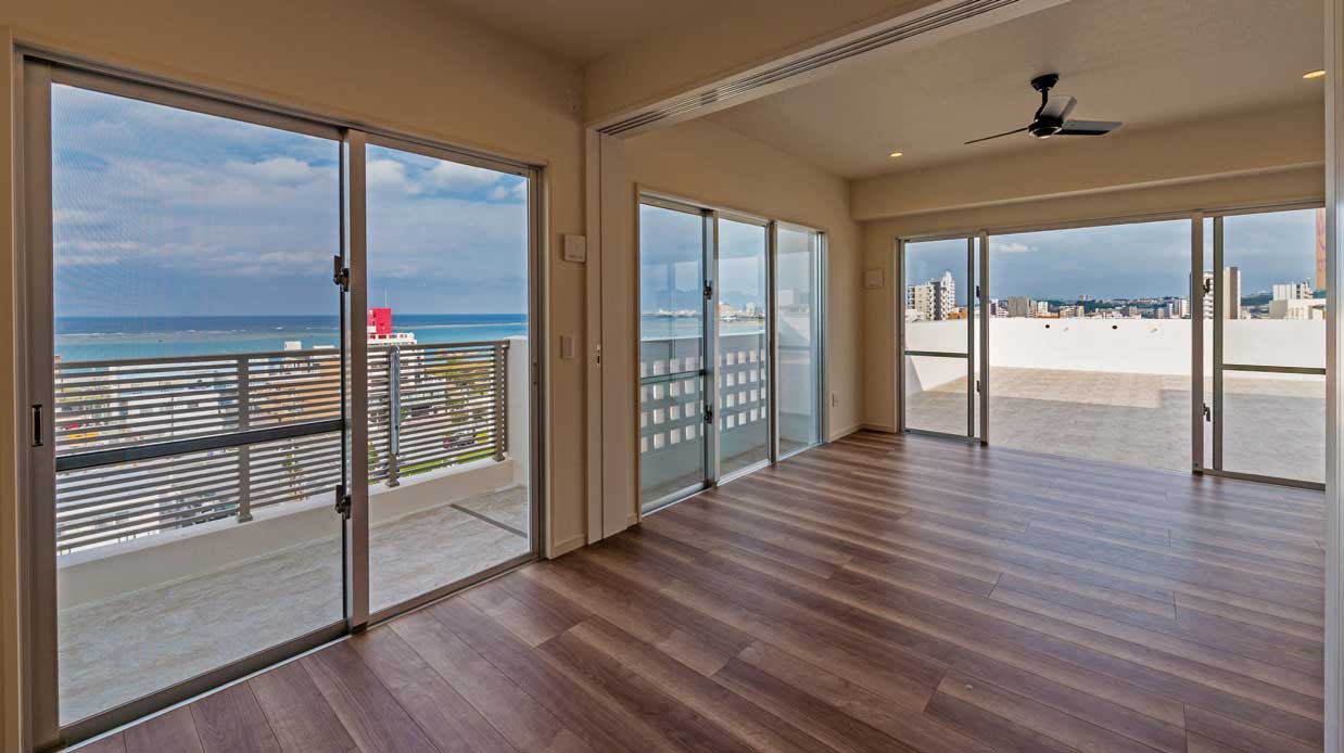 モデルルームは設けずに現地周辺ではなく、弊社事務所隣地(浦添市)にサンプルルームを設け、広告はポータルサイトのみで営業活動を行い、販売開始から3か月と短期間で完売に至りました。この短期間で完売できたのも、北谷が沖縄屈指のリゾートタウンとしての魅力と注目度の高さがあり、居住用、セカンドハウス、投資物件と多岐にわたるニーズに合致した設計プランの結果と考えます。
