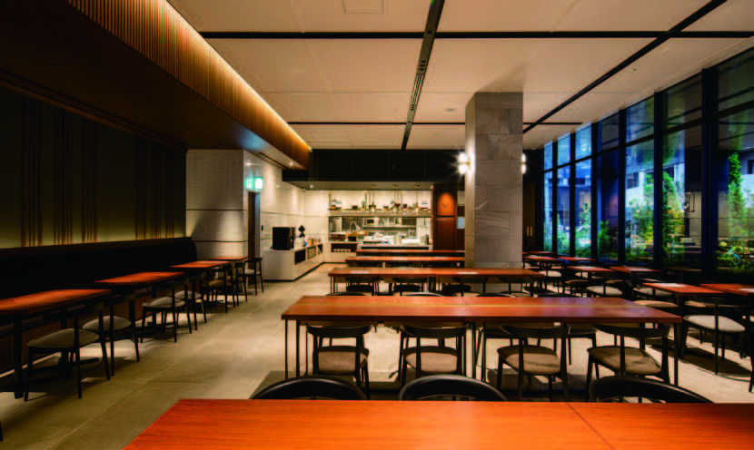 エントランスロビーとレストランは、一つなぎの空間として、広がりと開放感のある空間としている。