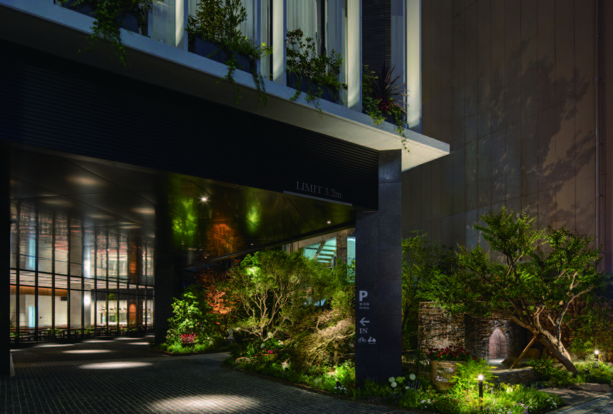 低層部の軒庇や縦格子による陰影、縦ラインを強調した高層部の壁面デザイン等による日本の凛とした佇まいと、ダイナミックな壁面緑化や四季折々の植栽を配置した庭園等、周囲に潤いを与える特徴的な緑化との一体化を図った。