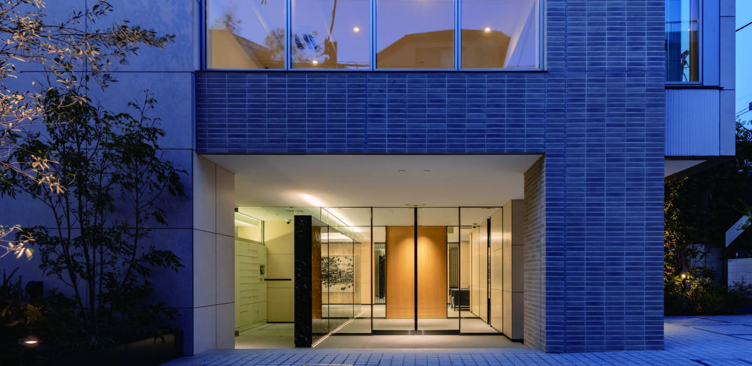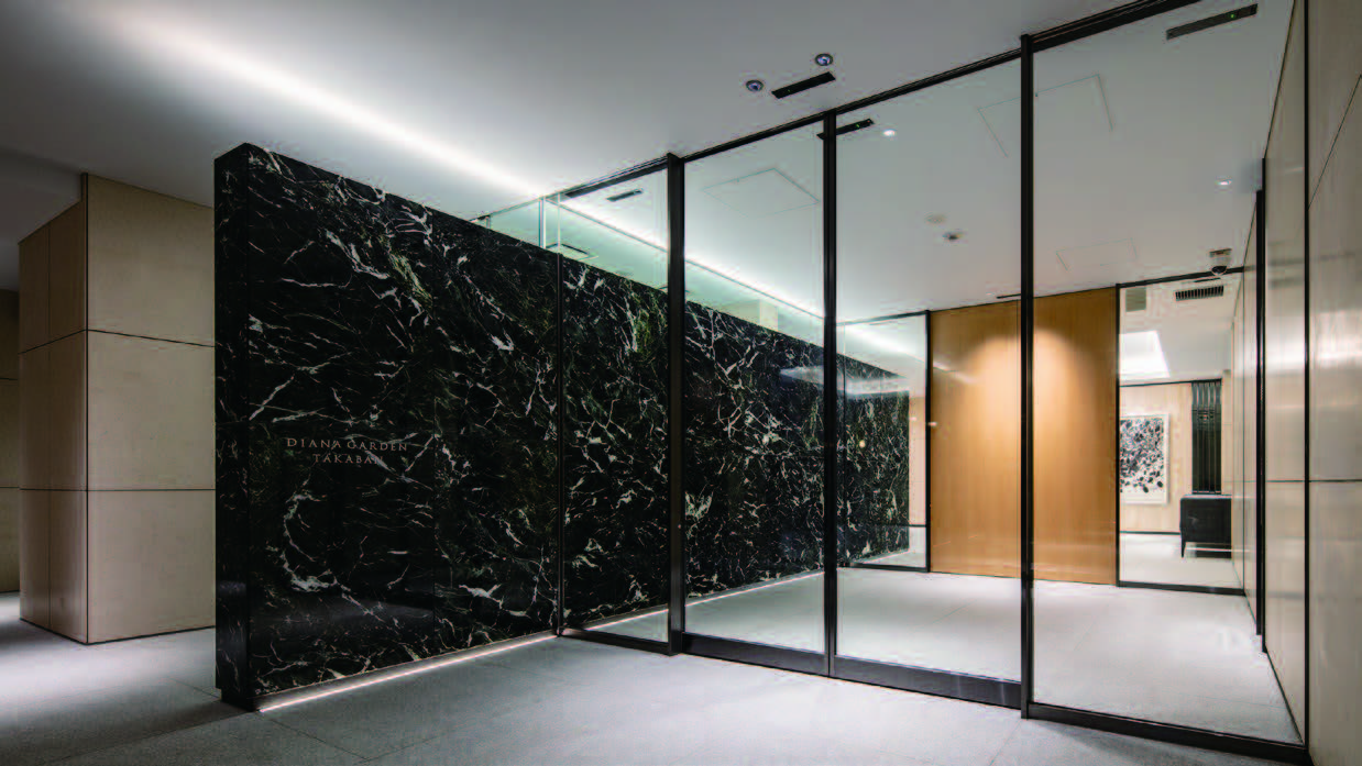 鷹番の閑静な街並みに調和する洗練性と高い格調を保持するため、外観には天然石とタイル、最上階にはガラス面が印象的な壁面デザインを創造。