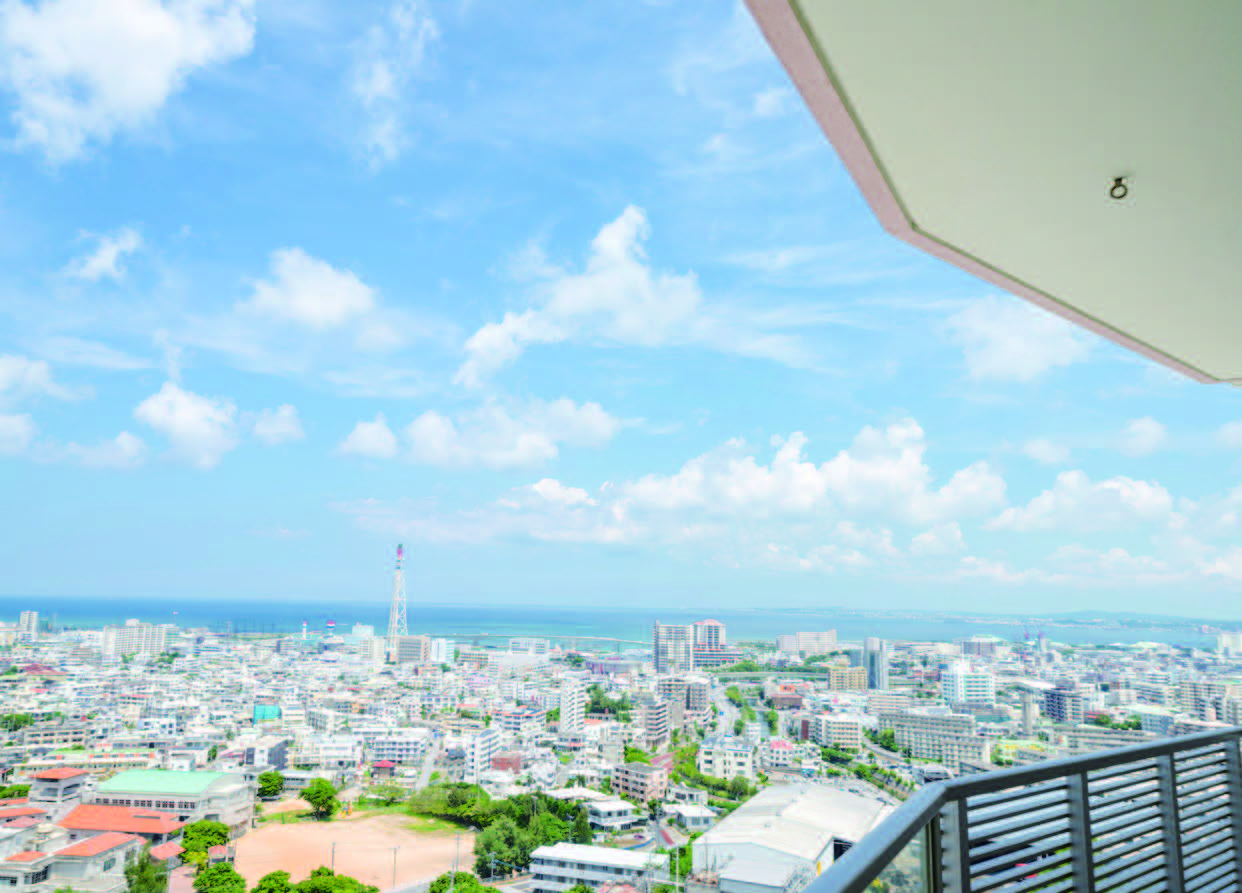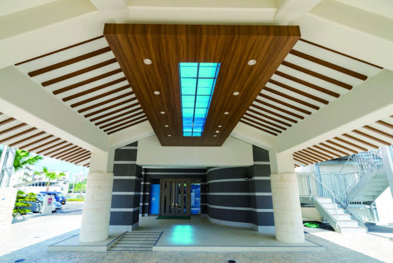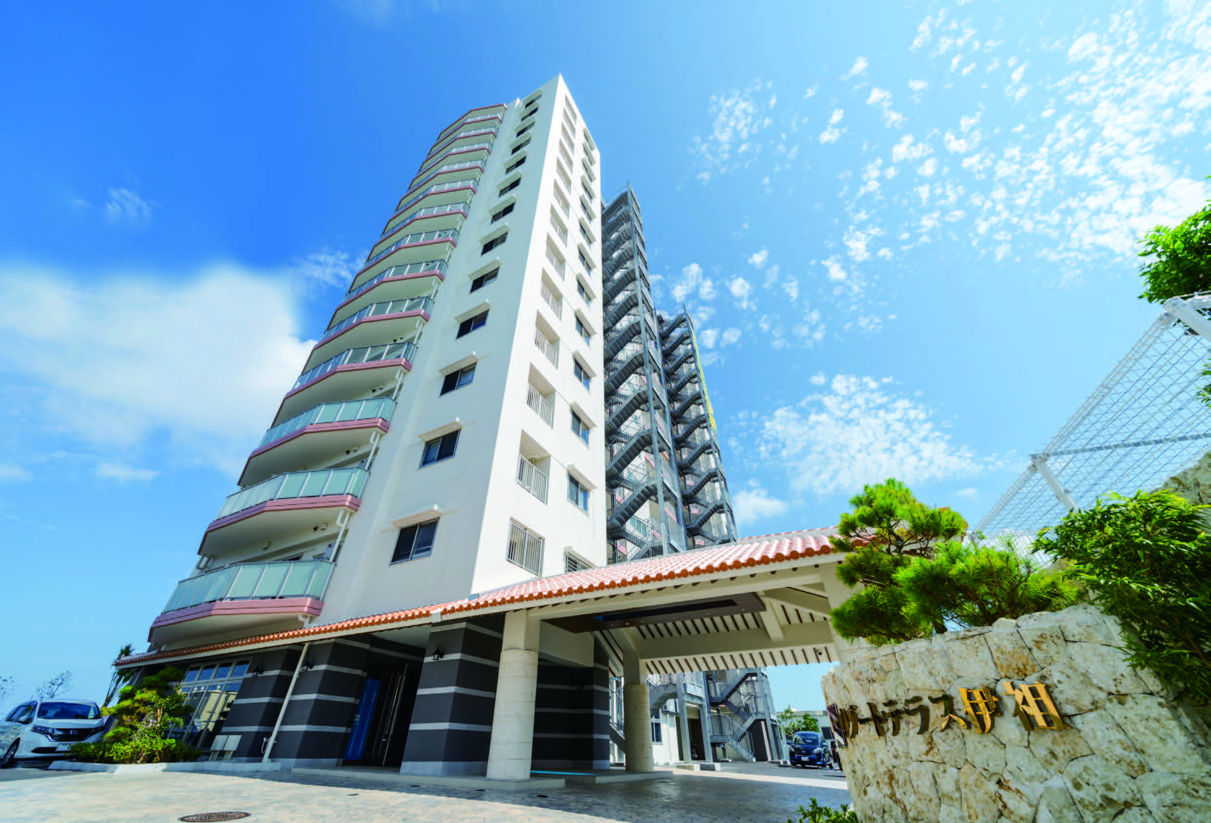 琉球王朝発祥の地、浦添市伊祖に「伝統文化とリゾートの融合」した「丘の上のグスクリゾート邸宅」として計画された67戸の中規模物件。敷地は海抜48m の高台に位置し、オーシャンビューを訴求するため15階建とし、最上階で海抜100m 弱の高層マンション。ロビーには紅型作家のオリジナルの作品が飾られており、日常から沖縄伝統文化に触れられるように配慮している。最上階の屋根には赤瓦の勾配屋根を採用、玄関周りも赤瓦屋根の車寄せ、石積みのヒンプン、石張りの床など琉球文化とリゾートを感じられる。