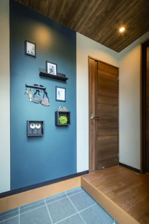 白、紺、茶をベースに軒の出をなくし、片流れ屋根を組み合わせシャープなフォルムを演出。都会的でスタイリッシュな外観意匠とした。