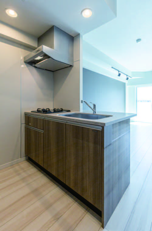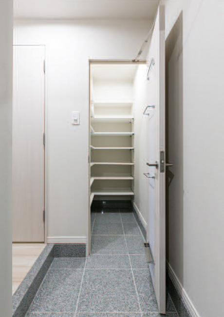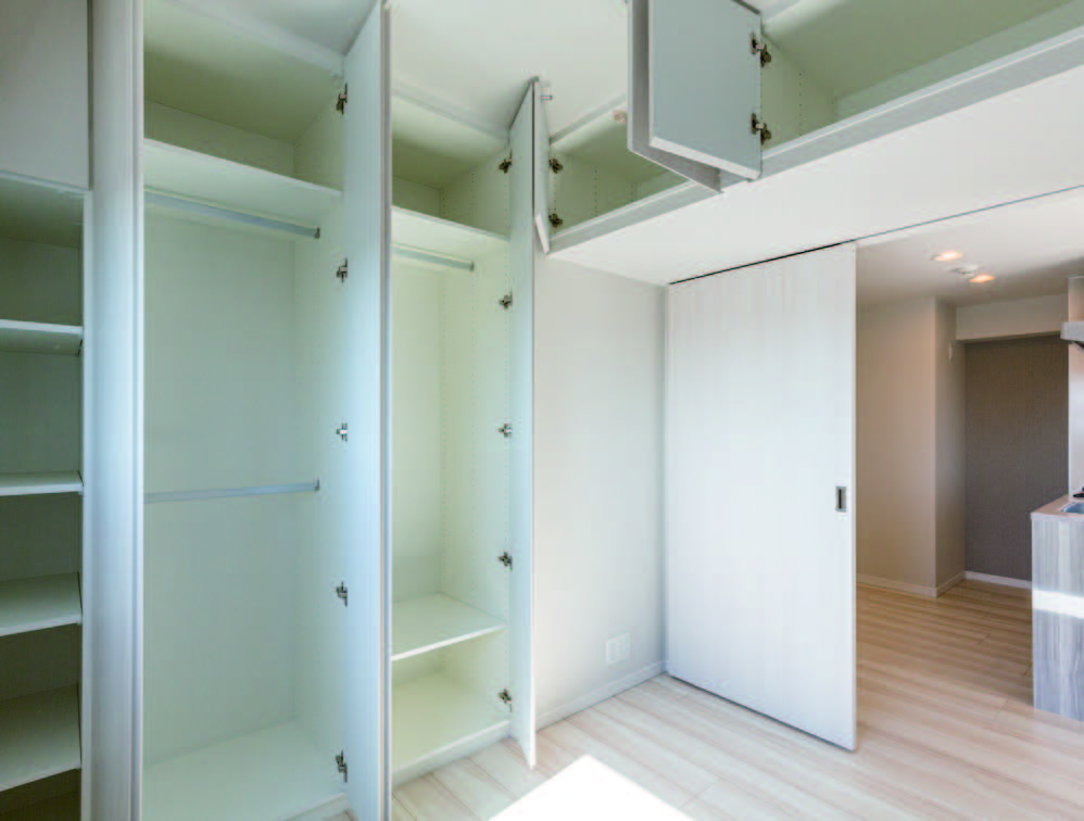 また、専有部内の限られた空間で収納量を最大限確保するため、これまで設備用配管スペースとしてのみに使用され、多くのデッドスペースとなっていた水廻り部分の天井空間の一部に、当社が独自に開発し実用新案登録を取得した「アッパーキャビネット」を全住戸に設置しております。