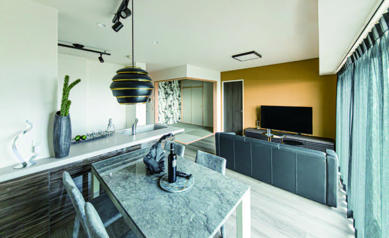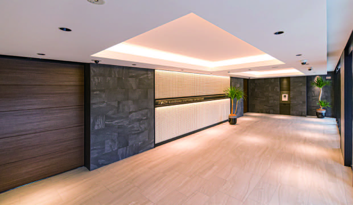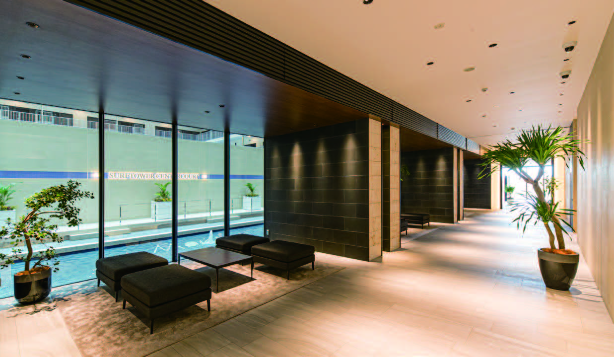 共用部は、光の陰影により空洞ブロックの壁面が風格と気品を与えるウェルカムホール(風除室)、幅30mの非日常的な広さとスケール感を演出したオーナーズラウンジ、色鮮やかな青基調のモザイクタイルを使用したザ・テラス・アクアブルー(水盤)が特徴的。
