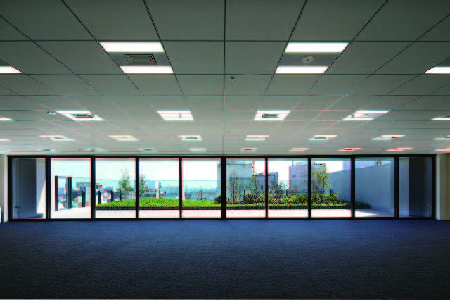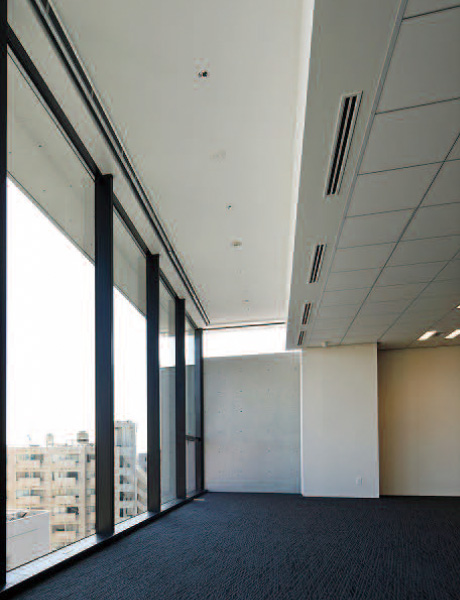 各階に水平の庇を配置して日射を遮断し環境負荷を低減。南面窓はLow-eガラスを採用。日射熱の侵入を低減。