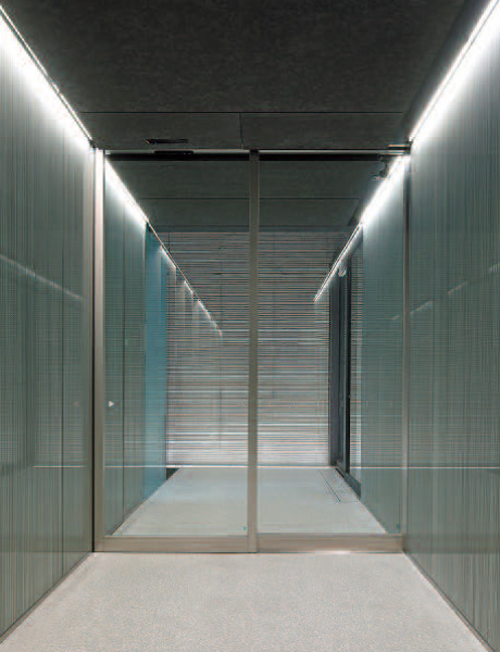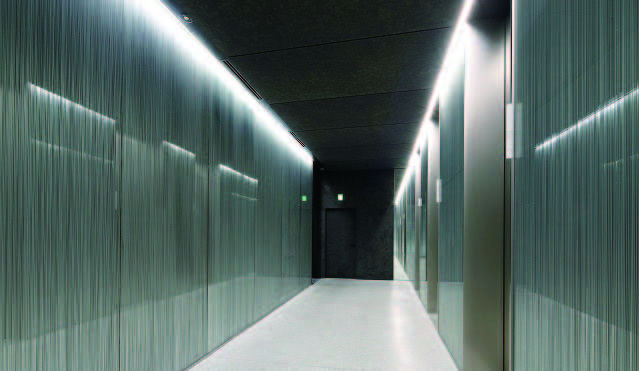 アプローチ空間の壁面はコンクリートを手作業で溝状に斫ったチェーン引き仕上げとし、床埋込みの照明を受けて空間全体を明るく照らし、チェーン引きの陰影を引き立たせている。外壁面のコンクリートは誘発目地のないコンクリート打放しを実現し、目地ピッチの持つスケール感から建物を開放して存在感を際立たせた。