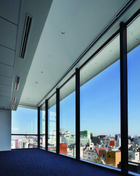 各階に水平の庇を配置して日射を遮断し環境負荷を低減。南面窓はLow-eガラスを採用。日射熱の侵入を低減。