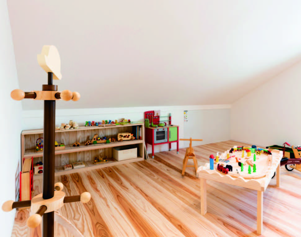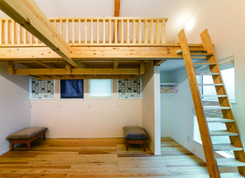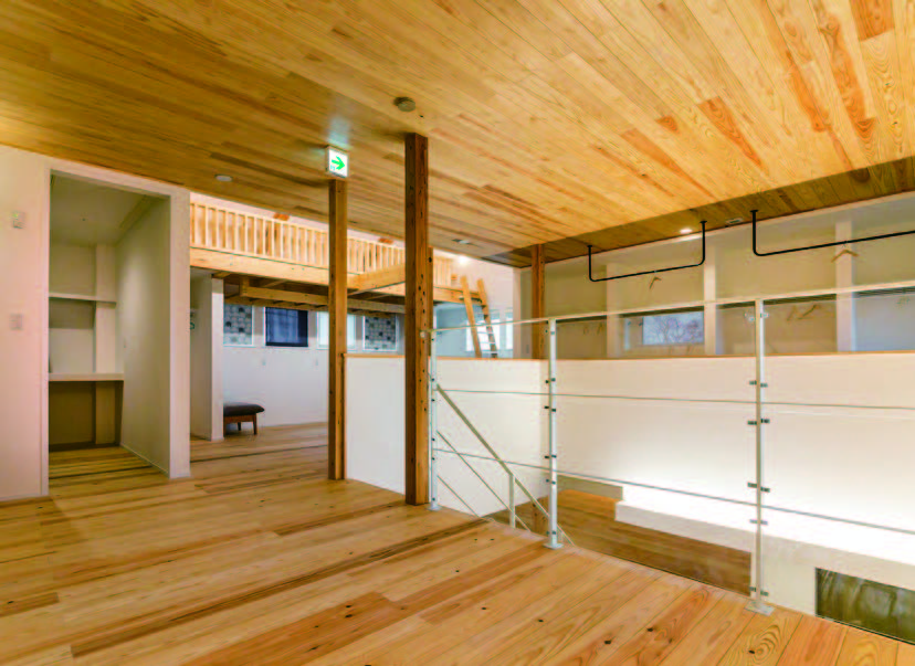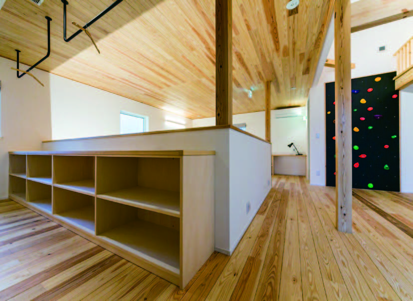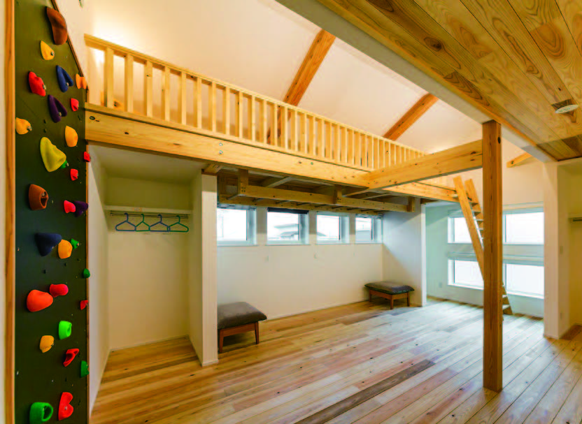 一泊して住み心地の良さを体感していただくための施設であり、部屋間の間仕切りをなくしたオープンな間取りとなっております。木の香りに包まれた「深呼吸したくなる家」(コンセプト)で、キレイな空気と温度や湿度のコントロールされた空間となっており、2階には雲梯やボルダリングを設置、ロフトもあります。