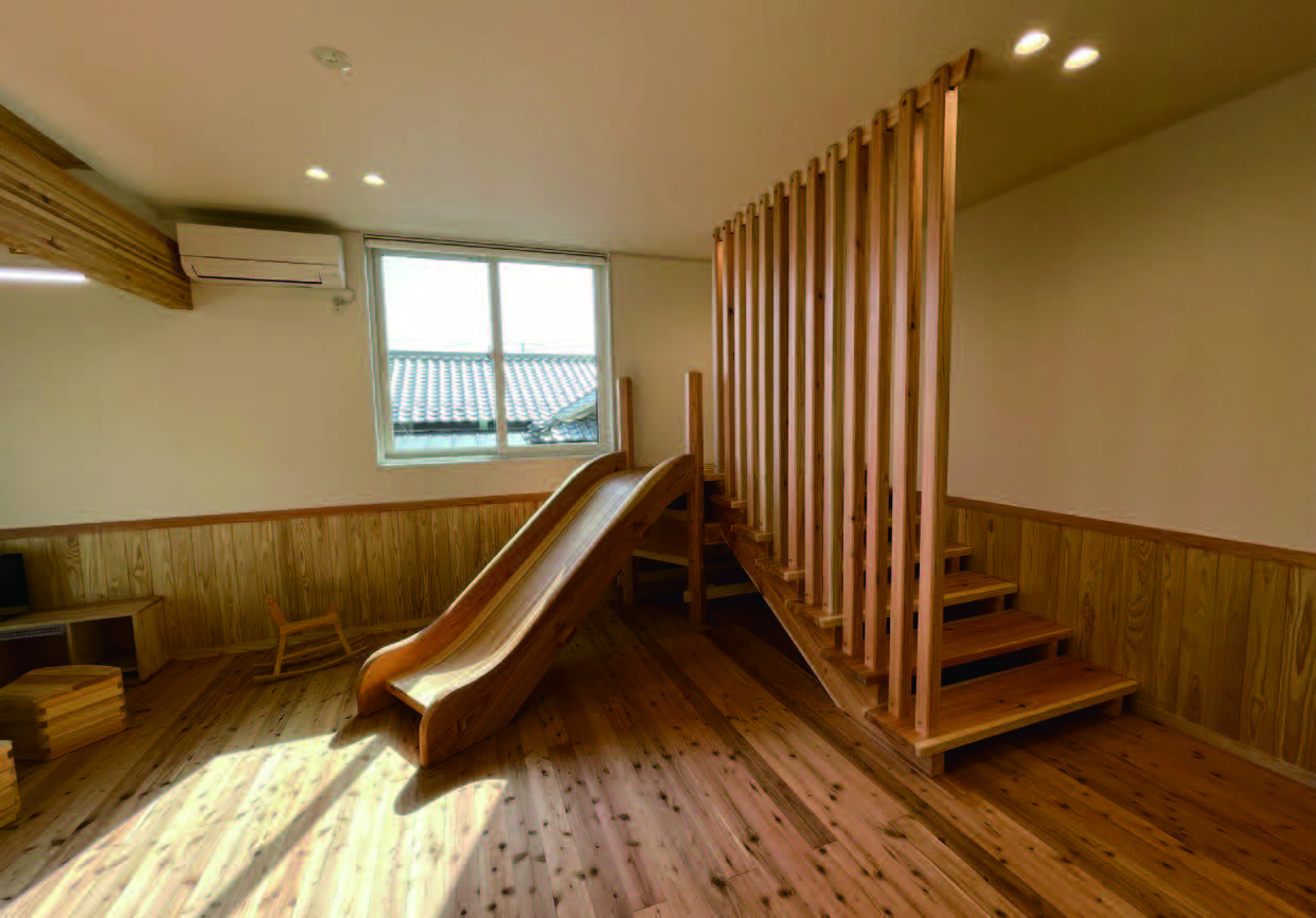「人と木(ひととき)の家」がコンセプト。1階の木育ひろば「ふぉれすと木っず宮城」には、宮城県産材で造った滑り台や家具・おもちゃを設け、子ども達が木の良さを存分に体感できるスペースとなっております。