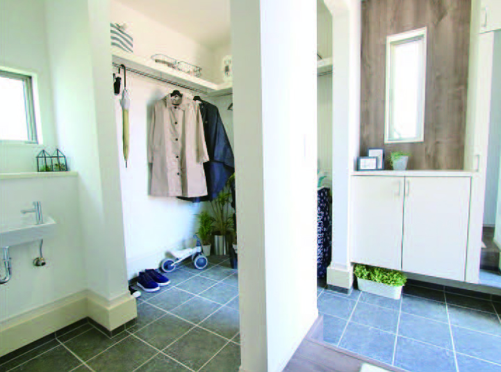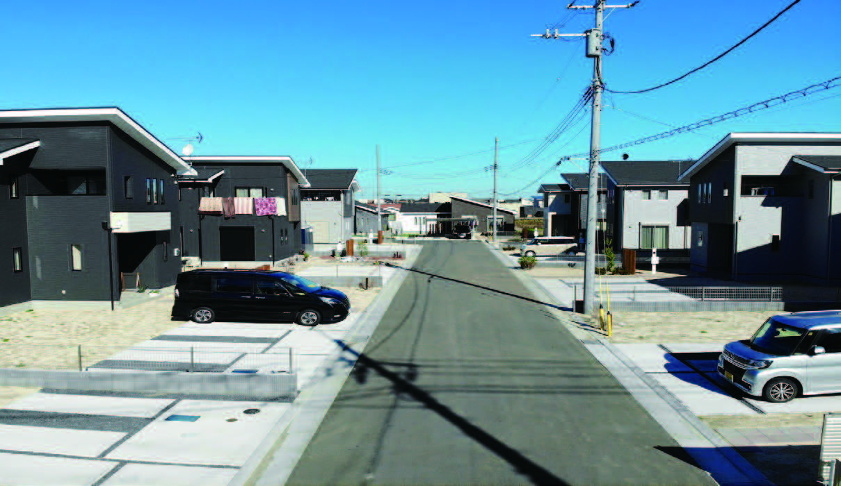 具体的なデザインの特徴として一番南側の区画の2棟の間口を5間とし、そこから北側の区画に向かって5.5間~7間と間口が広がるデザインとした。最後に最も北側の2棟を平屋でデザインし、南側から北側に向かって全ての邸宅を見渡すことができる。間口を順に広くしていくことで全棟バランスよく南側採光を確保することができ、全ての邸宅に風と光を感じられるデザインとした。また、この全邸宅を見渡すことができるデザインは防犯面でも効果を持ち、子供が遊ぶ際の見守りやすさはもちろん、近年さらに増加傾向にある車の盗難被害に対しても、夜間の街灯りと抜け感により対策となっている。建物仕様としては今や当たり前となりつつあるワークスペースや手洗い水栓を設けたエントランスクロークを設け、昨今の不自由な生活から解放された後も暮らしやすいプランとした。