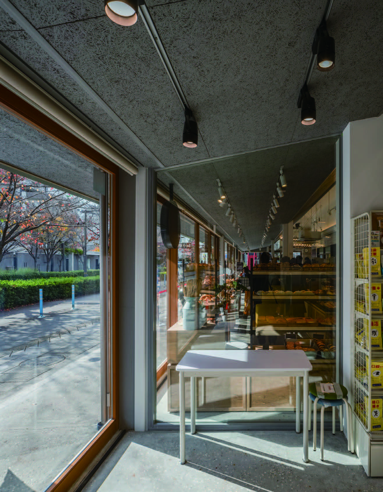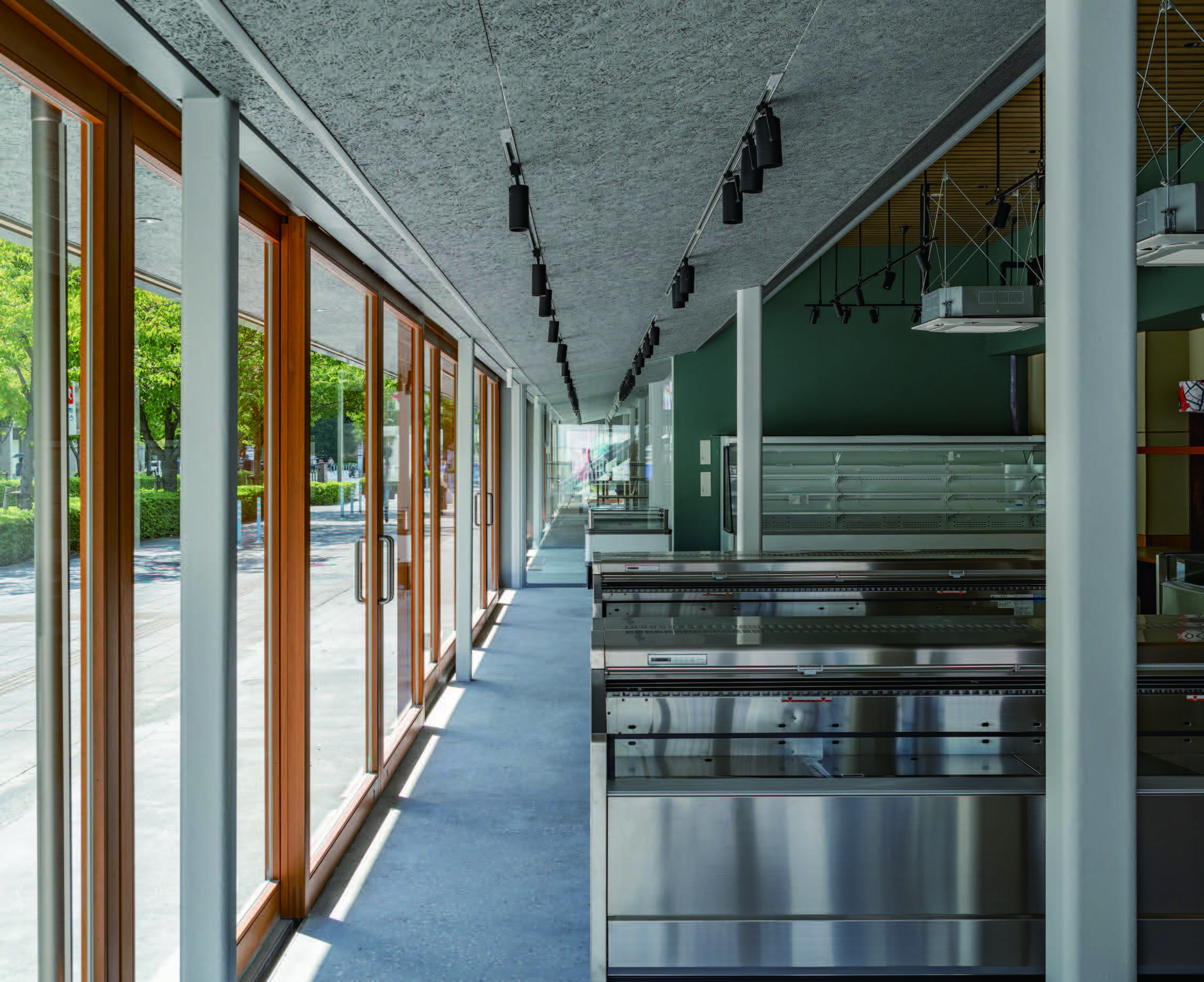 真夏や真冬以外の季節には、自然換気により空調に大きく頼らない計画にしたいと考えていたが、現在、感染予防対策から、南側サッシを大きく開けて営業しているテナントもある。