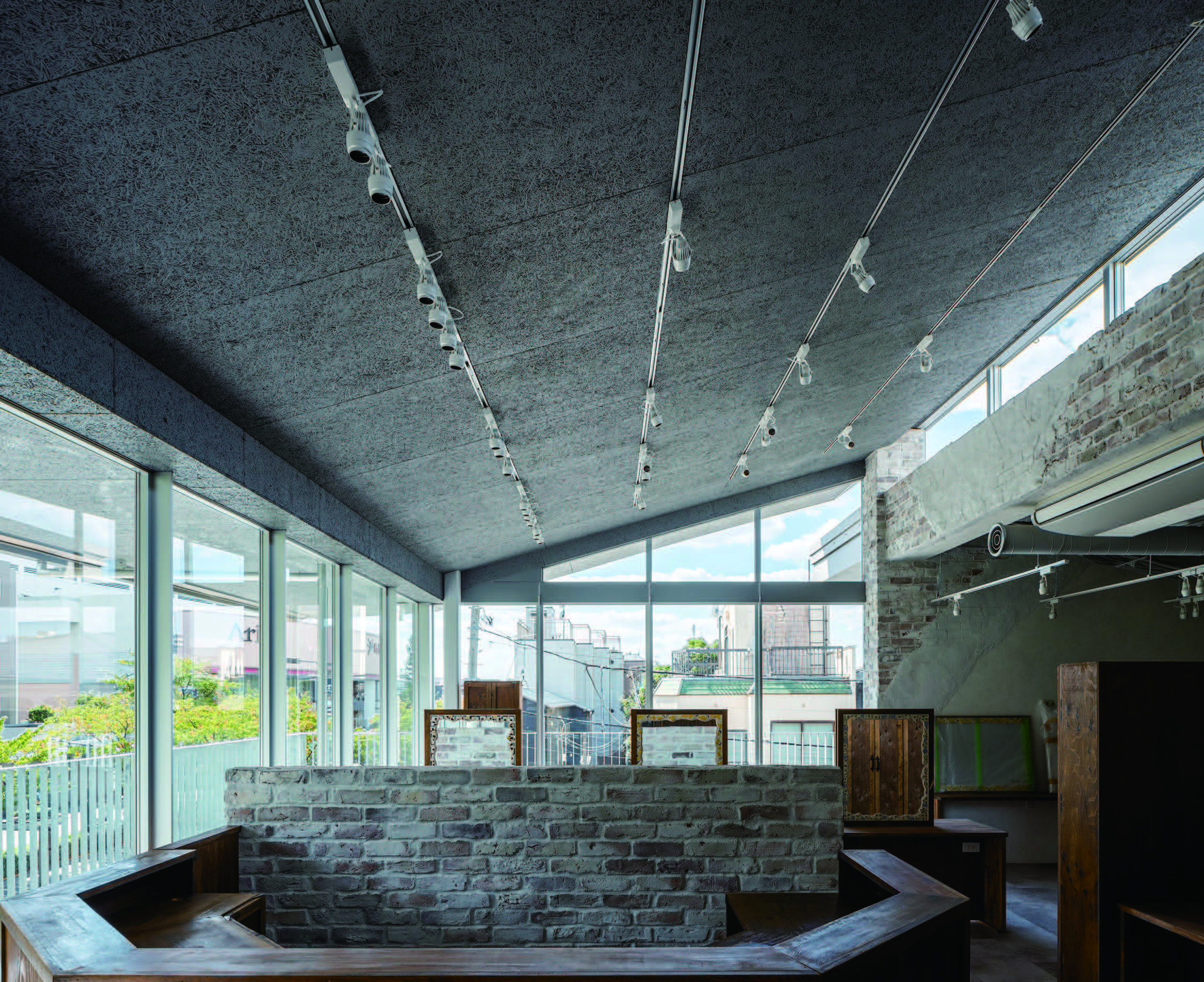 日影範囲を最小限にするため勾配屋根とし、路面店であるメリットを活かして南面はガラス張りとした。1階テナント区画を仕切る壁の一部を透明FIXガラスにすることで、リーシングラインは明確にしつつ、視覚的にはテナント同士の関わり合いを感じる曖昧さを生む空間となった。また、1階南側サッシより約900mmの範囲(庇下の店先空間)をリーシング範囲に加えることで、物理的に店舗内の賑わいがさくら参道に溢れ出す計画とした。