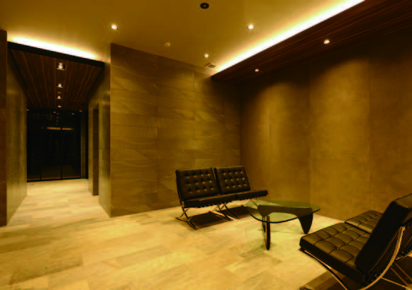 エントランスアプローチは奥へと導く植栽帯やその先にゲートのような意匠とガラス張りの透明感を設え、広がりの中にも洗練された趣を演出しております。潤いの緑とともに年々風格を増す佇まいです。さらにエントランスホールを抜けると独立性のある静穏なラウンジを設えております。