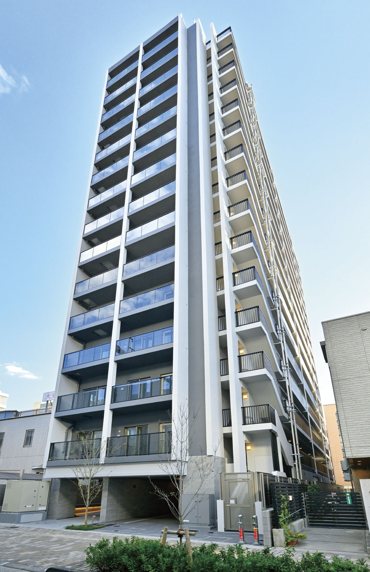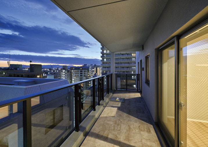 京王線「府中」駅徒歩4分に位置し、駅近の利便性と省エネ・断熱に配慮した生活を提供している。事業用地仕入時はL型敷地の形状成りの配棟計画としたが、計画専有面積を確保しつつ施工床面積の縮小等を図るため、I型配棟計画に変更し、採光に不利な部分に窓先空地(吹抜け)を用いて技術的に問題を解消した。京王線から至近に見える東側ファサードは、逆梁と柱型で大きなフレームと力強い水平ラインを強調している。面積帯は40㎡台/2LDK~60㎡台/3LDKまで複数のプランを用意し、シングルからファミリー層まで多種多様な生活ニーズに対応できる商品となり、竣工前の早期完売につながった。
