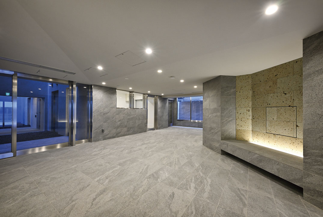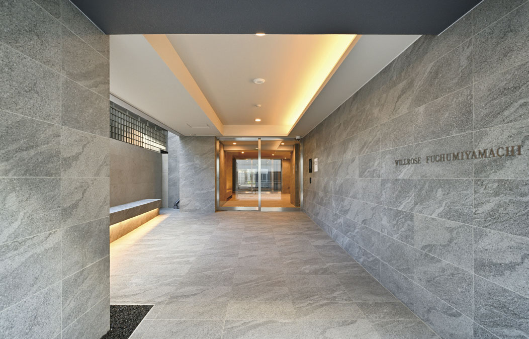 本件は京王線「府中」駅から徒歩 4 分の利便性が高い立地に位置する南北に長く、北側で市道、東側で都道に接する敷地に建設されました。都心勤務の若年層 DINKs からファミリーまで幅広いターゲットに対して駅近である生活の利便性と設備的に省エネや断熱に配慮した安心感のある生活を提供しました。