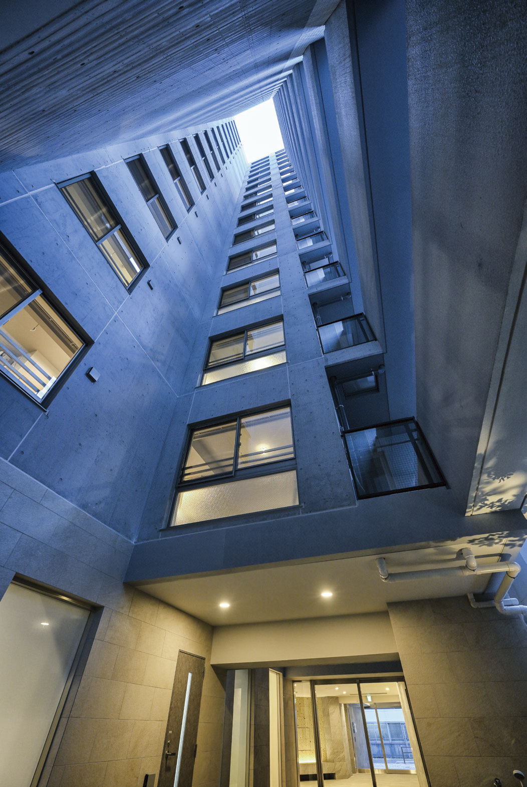 2 か所の接道を有していましたが共に間口が狭く、専有部分の採光確保のために 2 か所の 15 層吹抜けとなる窓先空地によりサービスルームではなく、居室として成立させる採光を確保しました。東側に面するバルコニー面は近接する京王線の高架からの視線や実質的な光の採取に配慮し、逆梁工法を採用しました。線路側には騒音測定結果の下で2重サッシを採用し、騒音対策を行いました。