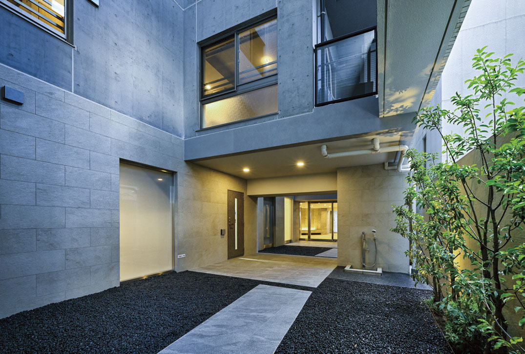 敷地形状としてより駅に近い市道から主たる居住者のアプローチ、都道からは駐車場と駐輪場のアプローチとし、歩車分離を図ることができました。条例上必要となる店舗区画は、セキュリティラインの内側に配置し、居住者コミュニティとの関連性にも配慮し、多彩な可能性を持たせました。