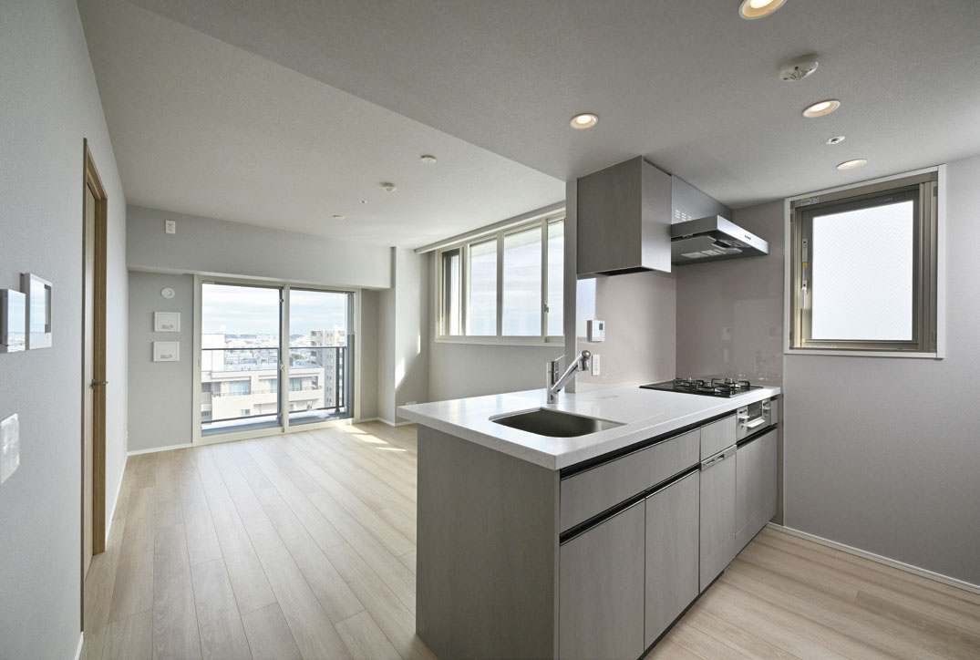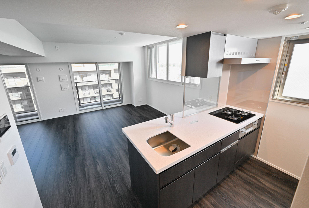 事業用地仕入時には L 型敷地の形状成りに配棟計画を行っていましたが、計画専有面積を確保しながらの施工床面積の縮小と、駐車場条例附置義務台数の確保を同時に実現すべく、I 型配棟計画とし、採光の不利な部分に窓先空地(吹抜け)を用いて技術的に問題解消できました。面積帯も 40㎡台 /2LDK ~ 60㎡台 /3LDK まで多岐に揃え、シングルからファミリーまで多種多様な生活ニーズに対応できる商品となり、竣工前完売 / 早期完売を実現することができました。
