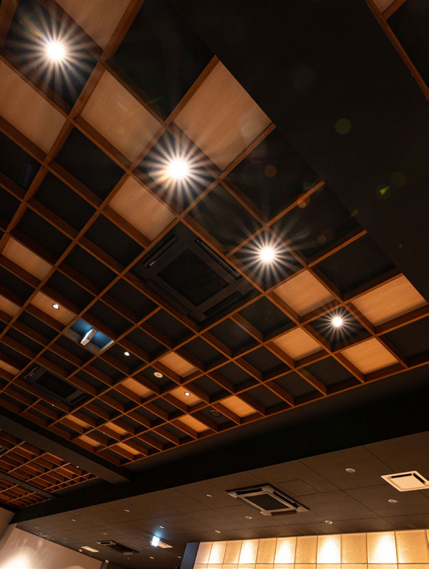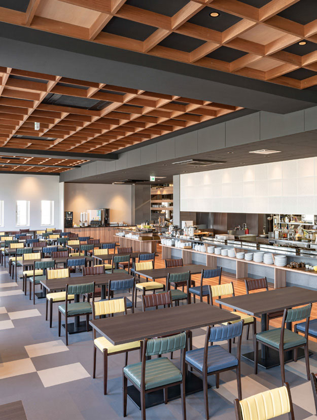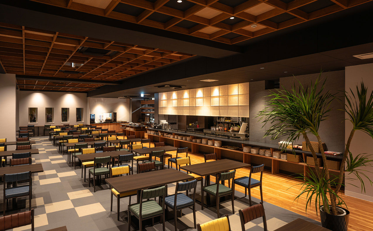 レストランは、みんさー織を模した木天井や琉球和紙をモチーフとした行燈照明を設置し、くつろげる空間を演出しています。