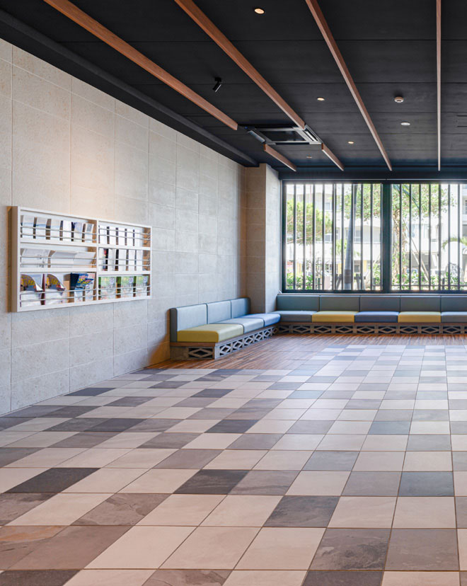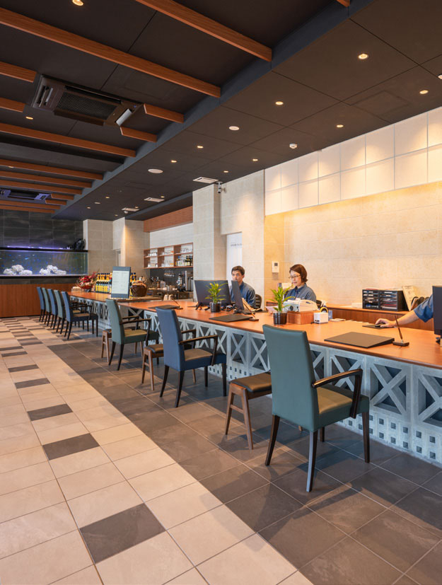 八重山諸島の大自然や独特の風土・文化をモチーフとした空間づくりを目指して、フロアごとに異なる3つのスタイルを計画。1つ目はマングローブやサトウキビ畑等の緑豊かな自然、2つ目は琉球赤瓦やデイゴ、祭事といった華やかな八重山諸島の文化、3つ目は透き通った紺碧の海と抜けるような青空を表現しました。琉球石灰岩やみんさー織をイメージしたエントランス・ロビーフロアには、カフェ&バーを設け落ち着きのある空間を演出しました。