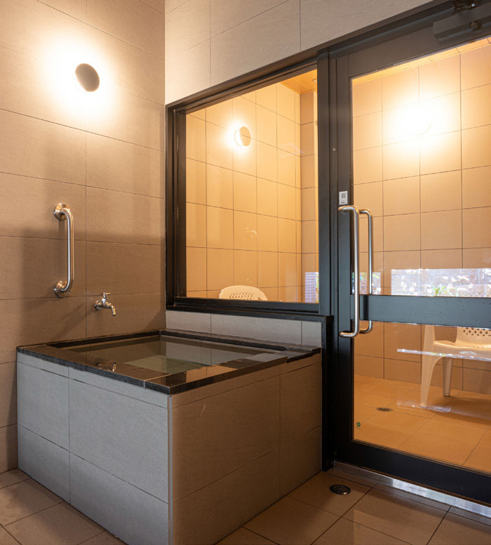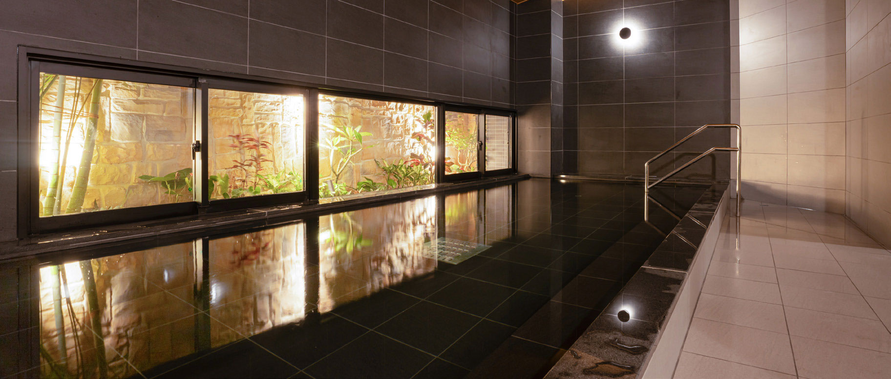 ミストサウナも併設した大浴場は、ゆったりとくつろげる浴槽から坪庭に植えられた八重山諸島に生息する木々が照らし出され、幻想的な雰囲気を演出しています。
