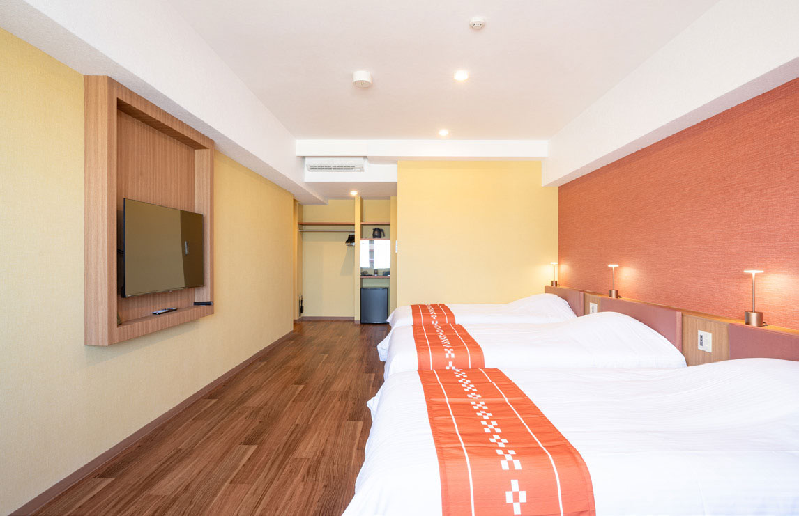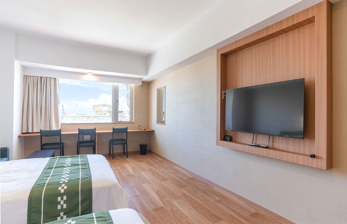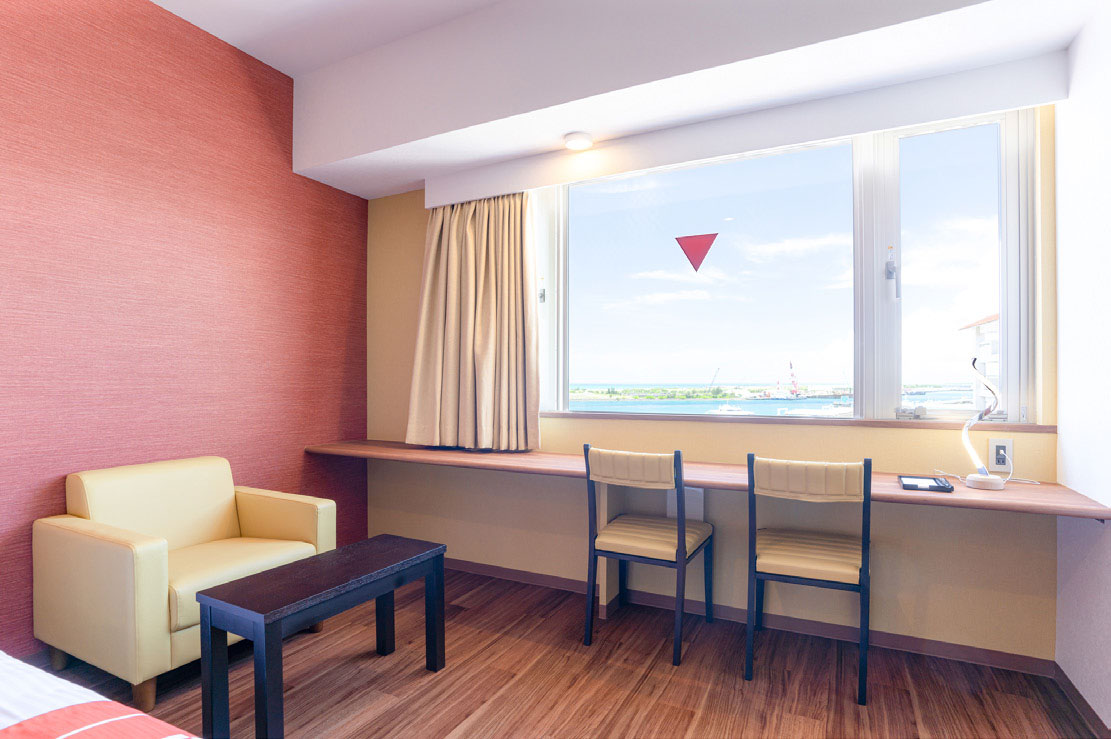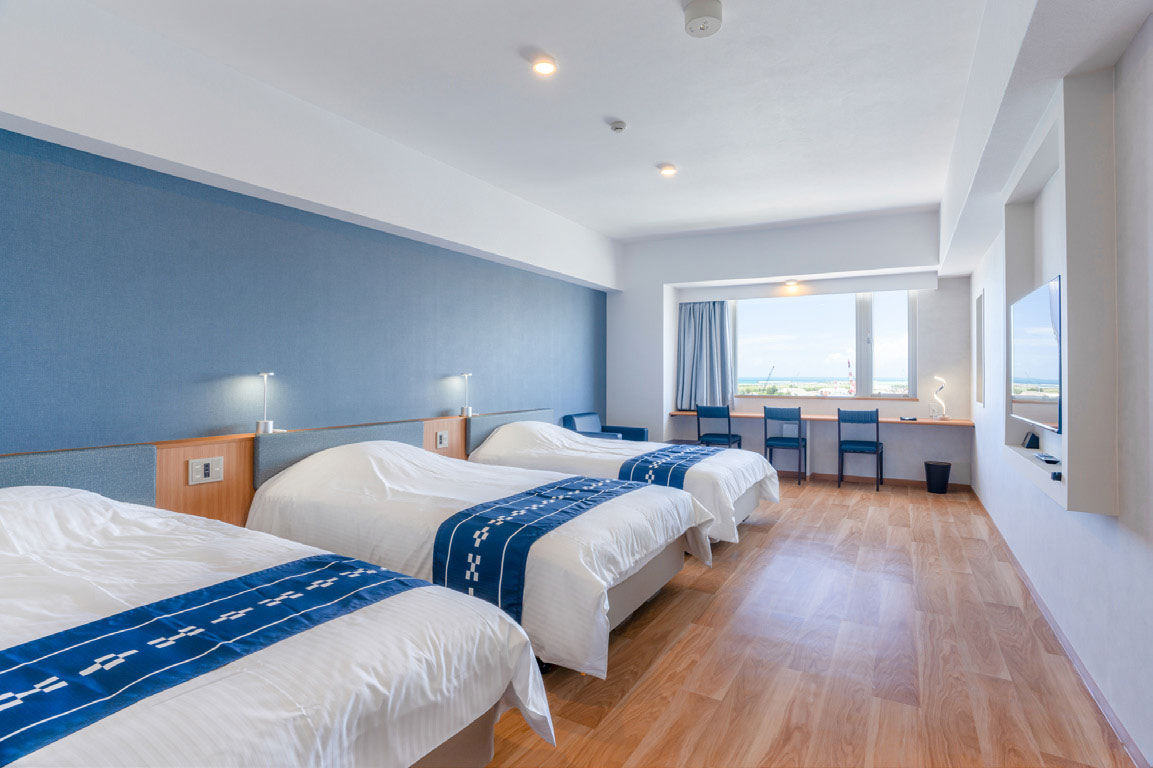 石垣島の建築特性として、輸送費や職人派遣代等が高くなるため、工法と資材・器具等は限定されており、さらに猛烈な台風とその後の塩害対策の必要性があります。限定された資材・器具等の組合せ等によるデザイン力が必要と判断し、名古屋工業大学の伊藤准教授(有限会社タイプ・エービー)にデザイン設計を依頼しました。客室は約 16㎡のシングル 16 室、約 27㎡ツイン 64 室、約 37㎡トリプル 12 室、35㎡ジュニアスイート4室、約 28㎡車椅子対応ツイン1室と約 22㎡添人用ツインです。