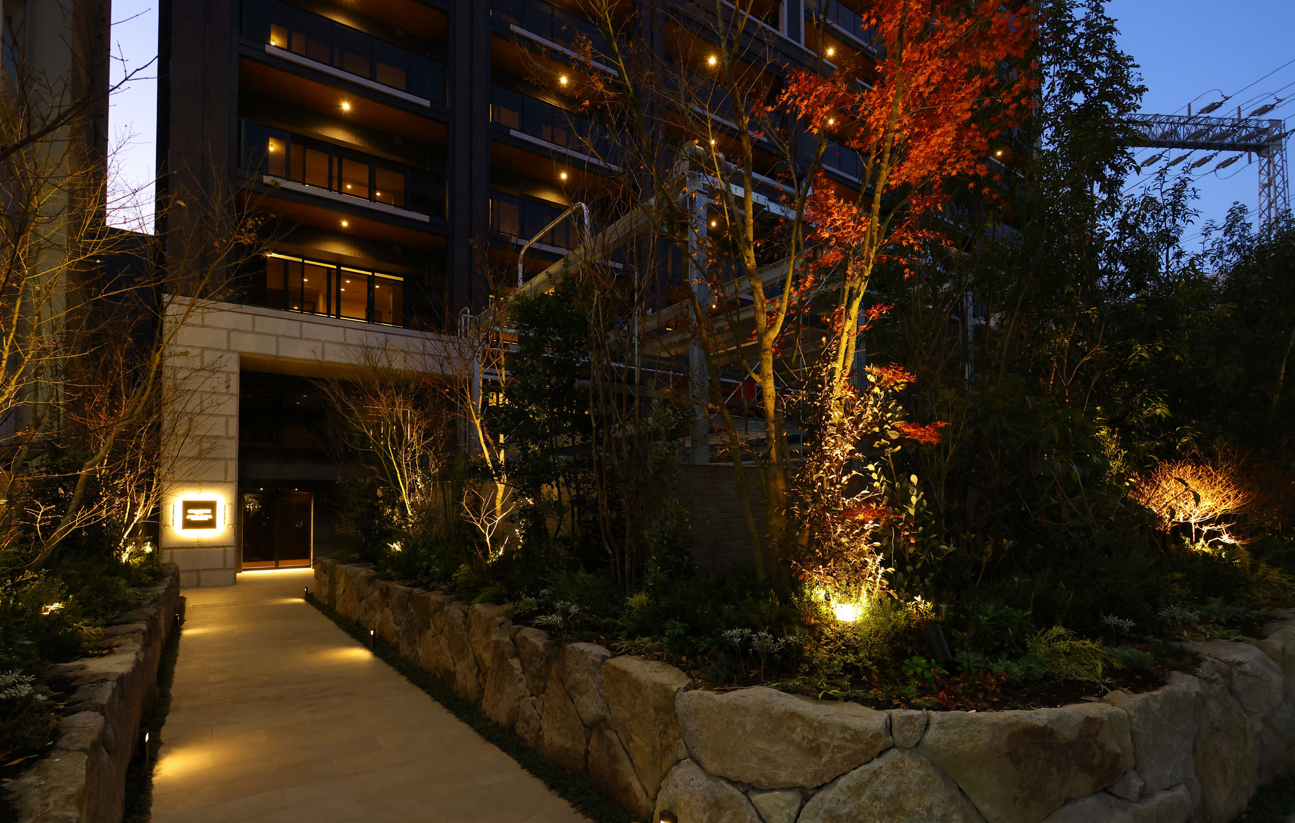 建物につきましては、駅前・角地・2 面道路の特性を活かしたランドプランとし、周辺環境と調和しながら静かに存在感を放ちます。低層階から上層階への色調の変化が安定感をもたらし、足下では植栽の豊かな緑が住む方々へゆとりをもたせます。