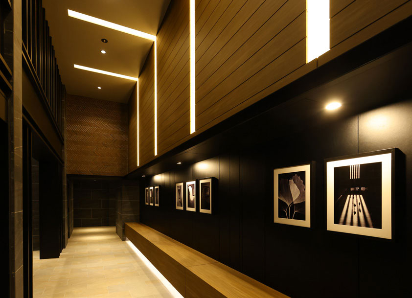 専有部の全てのサッシは外部から音を 30dB 軽減する防音サッシ(T2)を採用しており、ペアガラス、二重床、二重天井構造として、メンテナンスや将来のリフォーム時に自由度が増すようにしております。共用部には 15 台の防犯カメラを設置することにより、屋内外からの侵入者や盗難、不審物などを 24 時間見守り続けます。