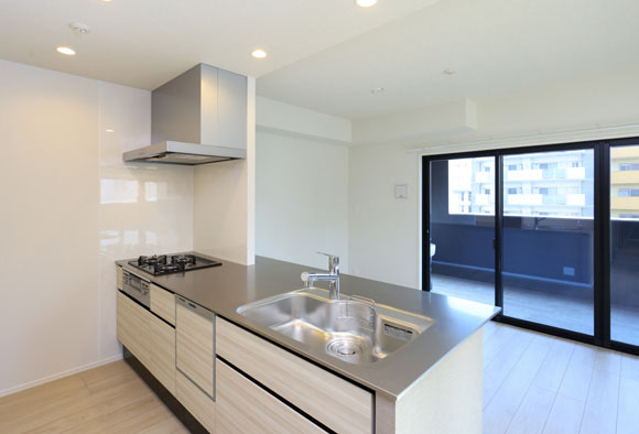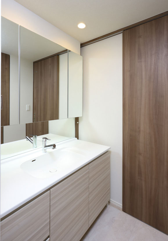 間取りにつきましては、都心型マンションの特性の良さを活かし、あえて 4LDK の広い間取りは考えず、 2LDK ~ 3LDK を主体とした構成にしております。また、ゆとりのあるスペースをリビング空間と一体化したプレミアムバルコニー(奥行 2m の木目調の天井に標準装備されたダウンライトの設置)が、上質な空間を広げ、開放感のあるバルコニーからの眺望も優雅な都心生活を演出いたします。
