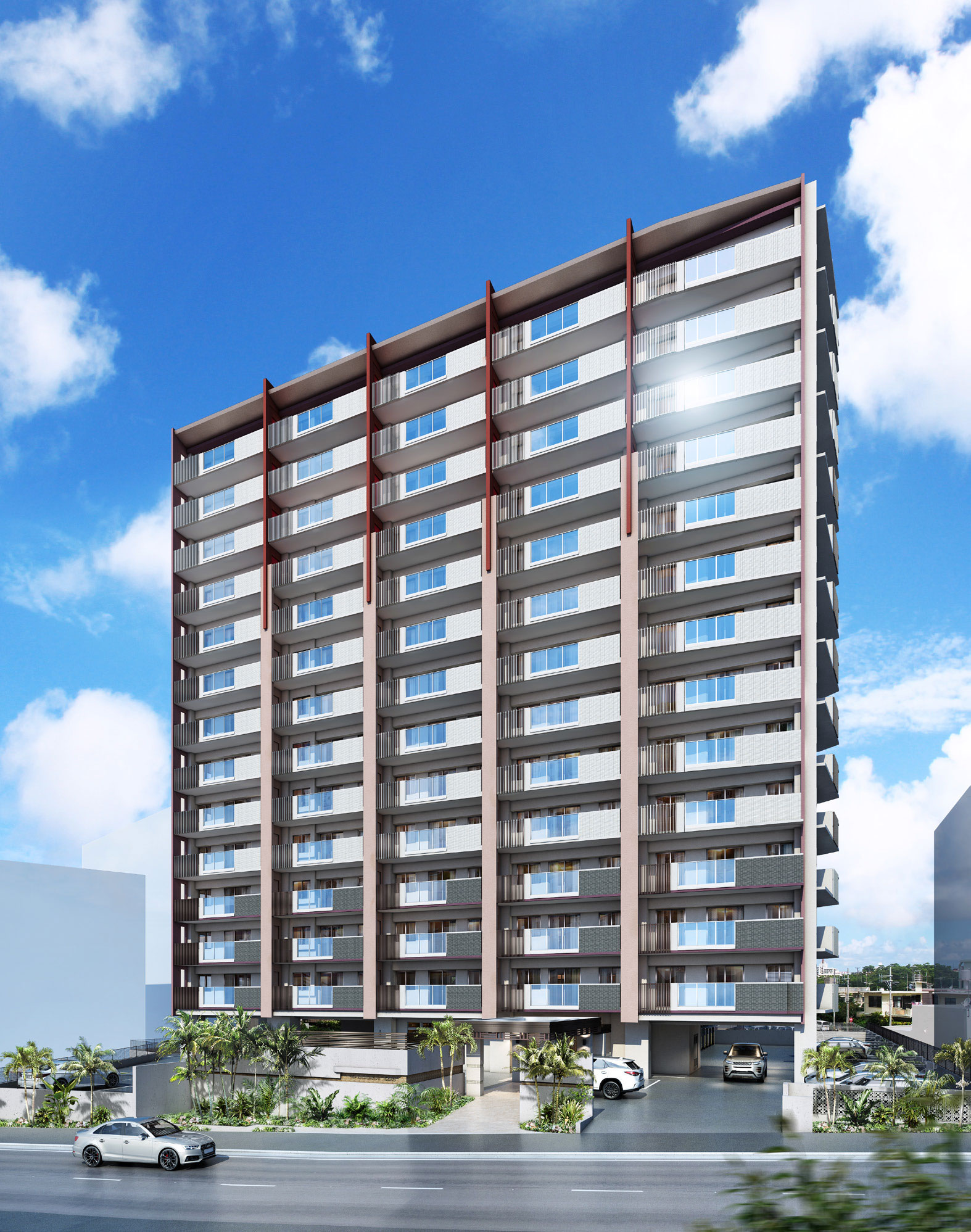 地上 14 階建全 65 世帯の大型マンションは、中城村の新たなランドマークとなる圧倒的な存在感。堂々としたス ケール感はありつつも、街並みと共存するよう、色合いなど緻密にデザインしたスタイリッシュなファサードも特徴の 1 つです。