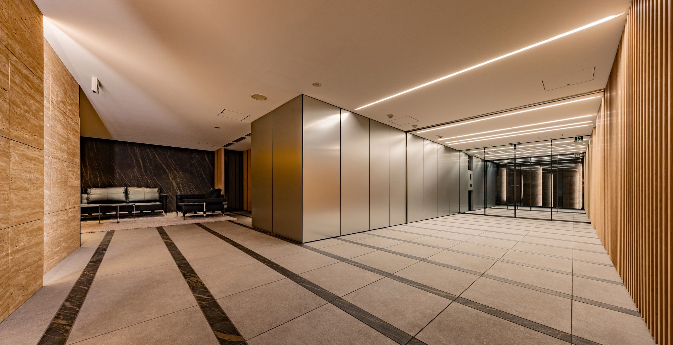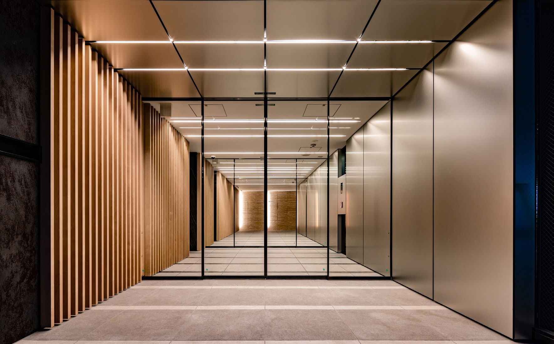 共有空間についてもアプローチを大事にして、そのアプローチが歩きながら変化していく工夫をしております。共用部のマテリアルはトラバーチン大理石で温かみのある光壁、アルミパネルなど多くの素材を使用。共用部のアプローチとロビーを一体に考えるのではなく、シーンが変わっていくことを重視しております。…