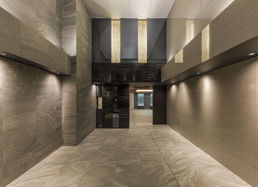 駅からの動線や視認性などを考慮し北東側にエントランスを設けました。正面からのアングルでは縦に細長く規模感の創出が難しい中で、アプローチを含めたエントランス周りでどれだけ印象付けられるかが意匠上の課題でしたが、存在感あふれる逆 L 字型の庇と壁を設けるほか、白御影石の上質な素材を添えるとともにクールな表情のアルミパネルを採用することで、壮麗な風格を醸し出す邸宅の顔に仕立て上げました。外観全体は、街の新たな風景となるよう洗練された建築美を追求し、モノトーンを基調にスタイリッシュな佇まいとしています。