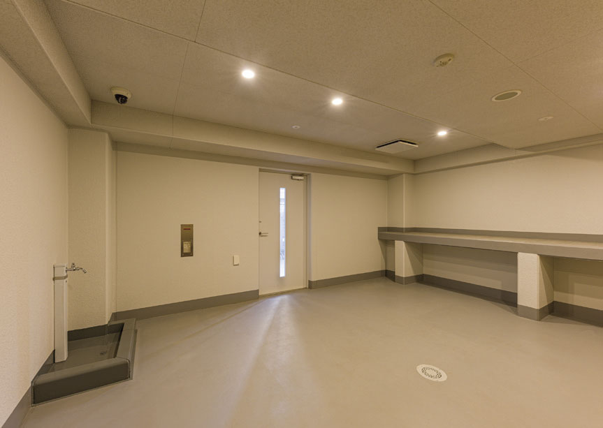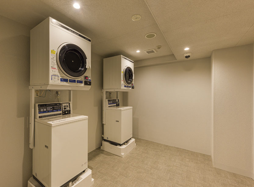 共用部には、居住者が日々の洗濯・乾燥を行うことができるランドリースペースを設けたほか、40 台分の駐車場に加えてバイク置場、駐輪場を確保。条例上の附置義務を満たす必要がある中でどのように計画を進めていくべきかの検討を十分に行い、最適なプランニングを実現しました。