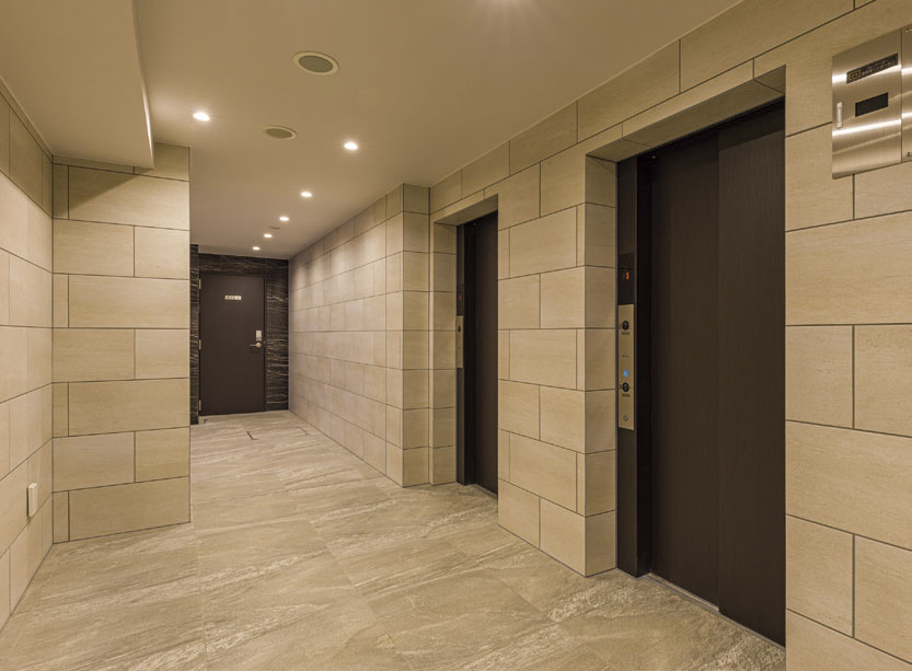 また、風除室ではホテルライクな二層吹抜けを実現するほか、その奥に続くエントランスホールは、ホワイト系のタイルや木目調のクロスを用いることで明るく柔らかな雰囲気を醸し出しながらも、高級感が漂う意匠としました。