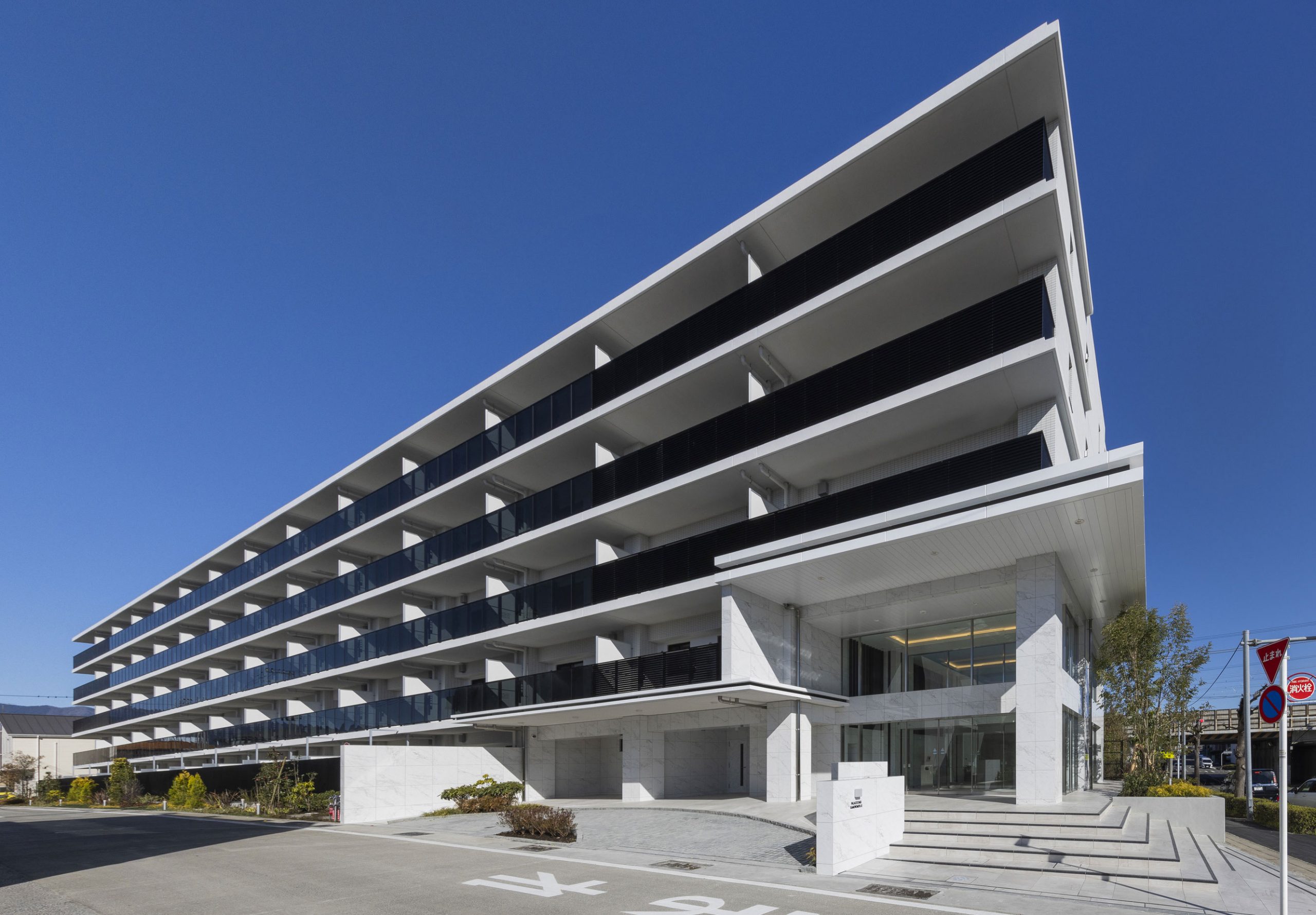 戸建中心の「鴨宮」駅周辺エリアに供給された11年ぶりの分譲マンション。デザインは、約93mある南道路と平行に配棟することでシンプルな形状で上品かつスタイリッシュに水平ラインを活かしたファサードとし、東南の角には大きく張り出した2段の庇を設けて、迎賓のエントランスアプローチや車寄せを配置した。あえて容積率を消化せず、階数を抑えた計画とし、駅近の立地にもかかわらず購入しやすい価格設定とした結果、全96戸を11か月で完売した。