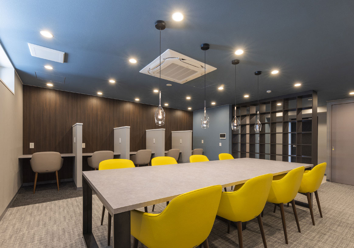 当初の計画では 98 戸のマンションとして事業計画を組んでいましたが、11 年ぶりの分譲マンションを企画するに当たり、街のシンボルにしたい!と思い県道に面する東南の角に住戸を1つ減らして吹抜けのあるシンボリックなエントランスとし、リモートワークや学習の目的にと様々な利用が可能なワークラウンジも住戸を減らして計画しました。